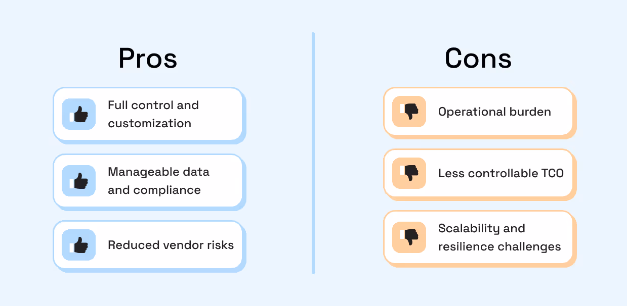- Potentially easier to align with specific data residency or compliance requirements if you control the environment.