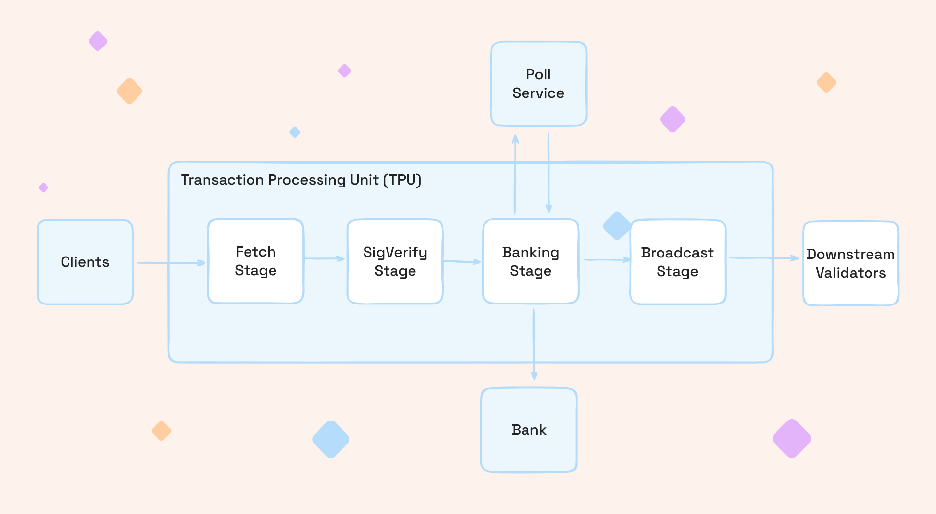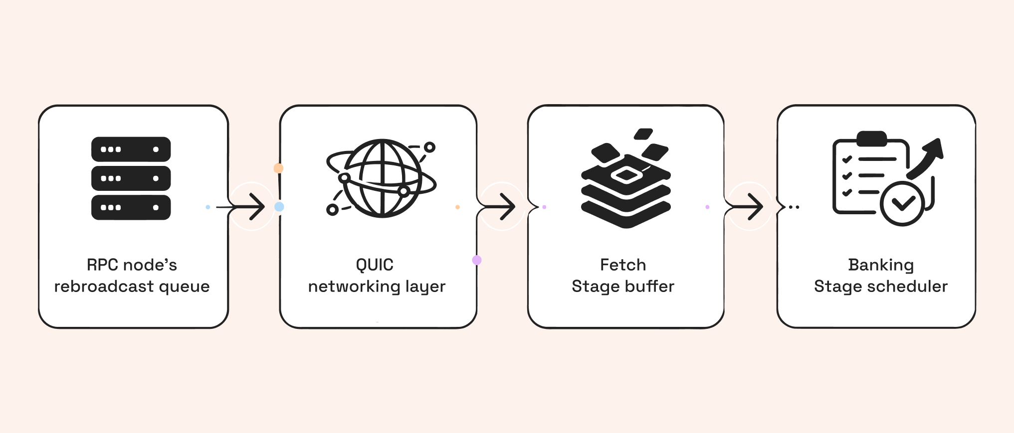The drop problem runs deeper than any single layer. A transaction travels through at least four distinct failure surfaces before it lands: the RPC node's rebroadcast queue, the QUIC networking layer between the RPC and the leader's TPU, the TPU's own Fetch Stage buffer, and finally the Banking Stage scheduler.