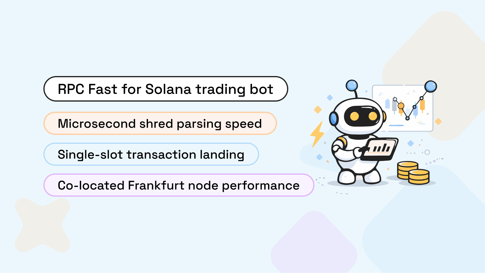 Get the most of the nodes and run the BSC via RPC Fast to avoid any infrastructure worries and concentrate on your own project. RPC Fast is an innovative programming tool that will help apply all API potential for your project. We care about the highest quality of blockchain nodes in terms of security, speed, low latency, and system responsiveness.