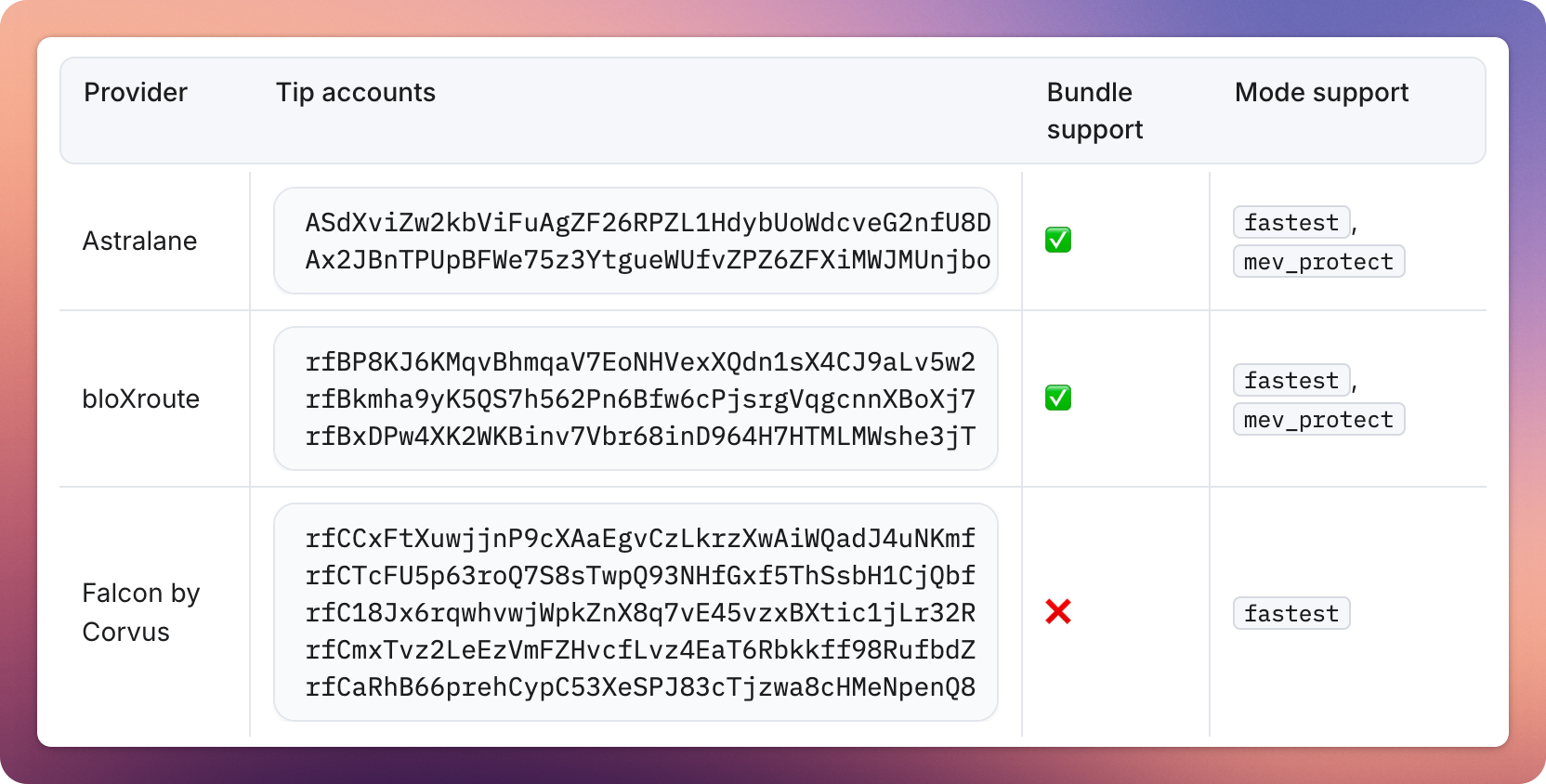 Don't hardcode a single tip destination. Rotate across provider tip accounts on every transaction. This improves privacy and distributes load across the provider's infrastructure.