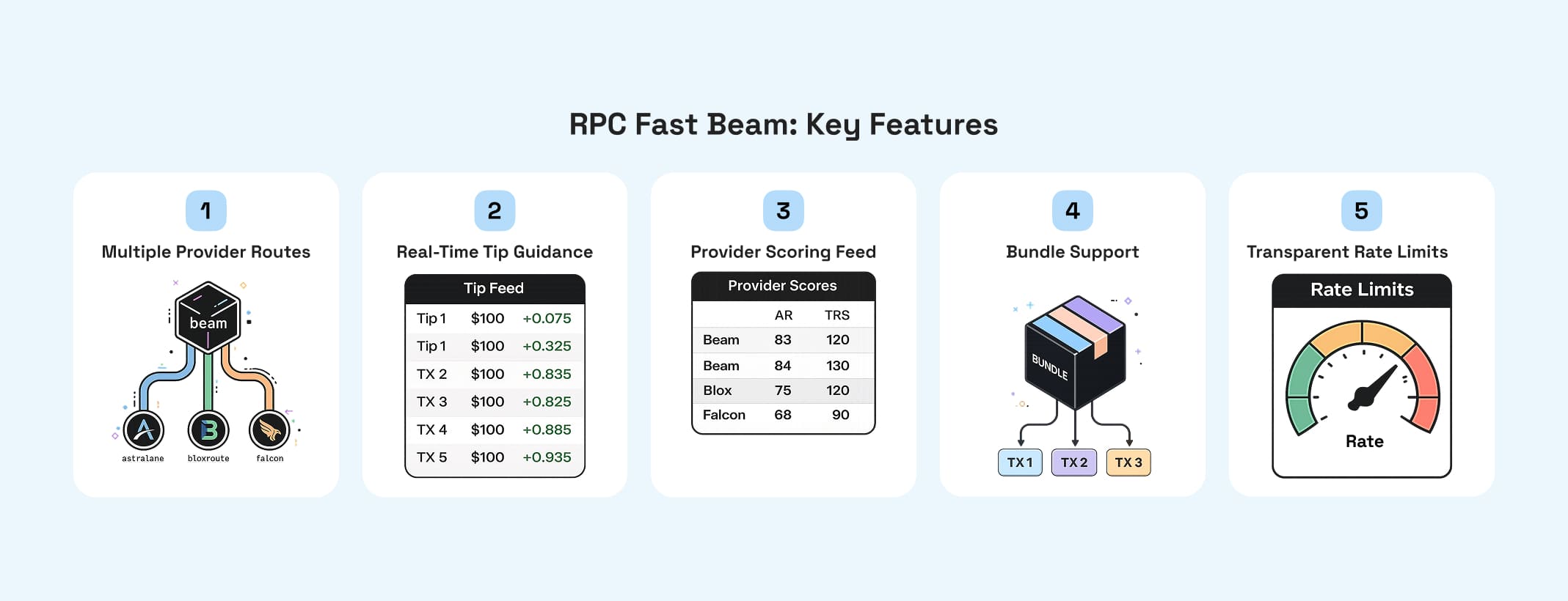 Beam doesn't lock you into a single delivery path. You can route through Astralane, bloXroute, or Falcon—each with different latency profiles and landing characteristics. The best practice is to distribute submissions across multiple providers in parallel to reduce reliance on any single route and improve overall resilience.