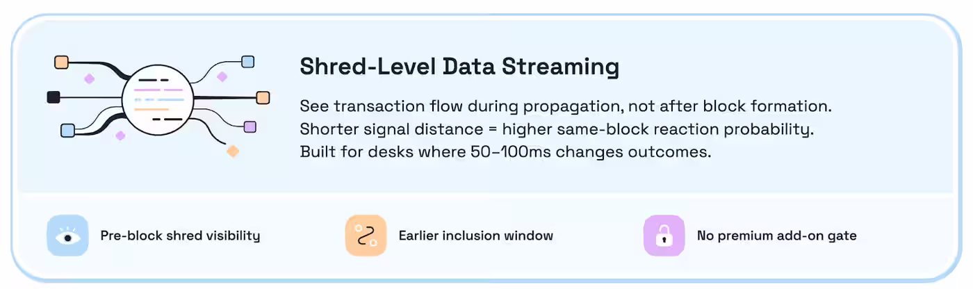 Available on the Aperture plan. Shred-level visibility means your system sees transaction flow during propagation, not after block formation. For same-slot execution strategies, that earlier signal window is the difference between reacting in time and reacting one slot too late.