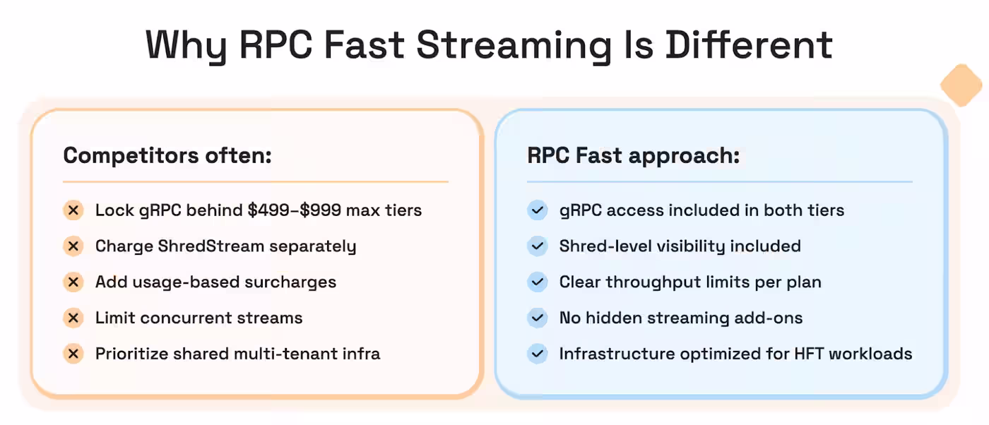 The pattern across most providers: gRPC is locked behind the most expensive tier, Shredstream is either absent or a separate purchase, and bandwidth charges add unpredictable cost at scale. RPC Fast includes gRPC from the Stream plan ($249/mo) and Shredstream in Aperture ($499/mo), with no bandwidth metering on any paid plan.