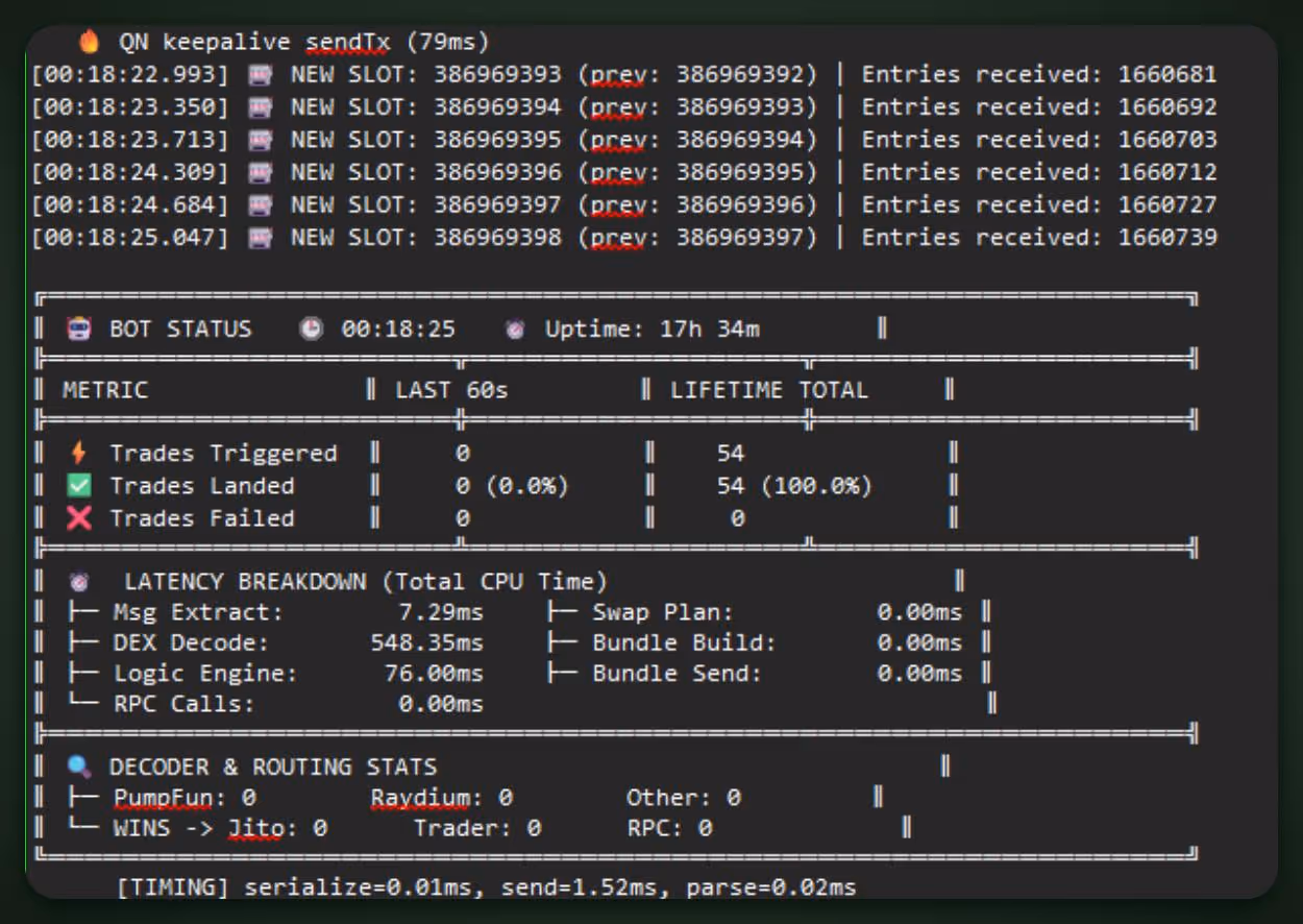 This is not a classic market-making engine, but the requirements are very similar: see keyflows first and react before the pack. The path that delivers same-slot or +1-slot copy trades is the same path that lands cancels on time in volatile markets.