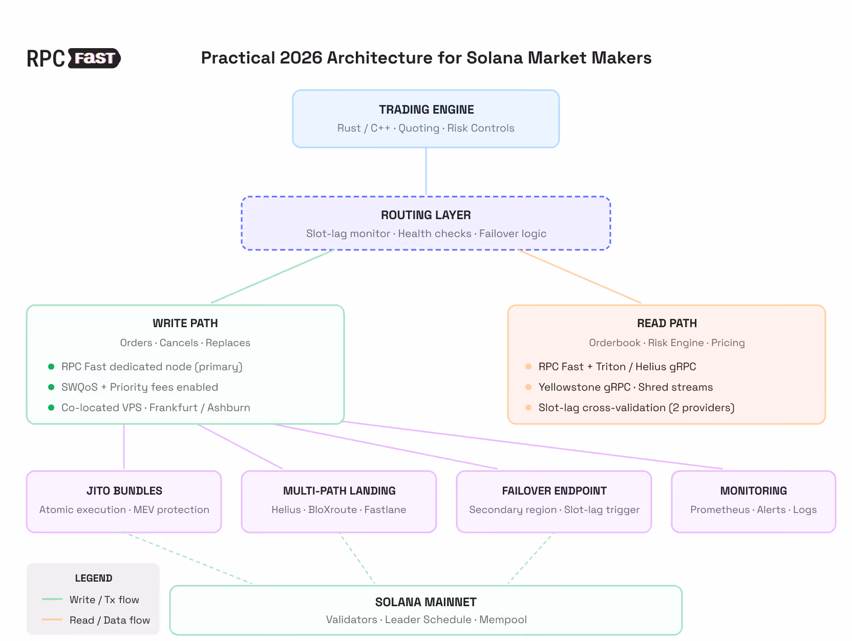 - Writes: Dedicated RPC Fast node in the same region as your trading engine, tuned for minimal jitter.