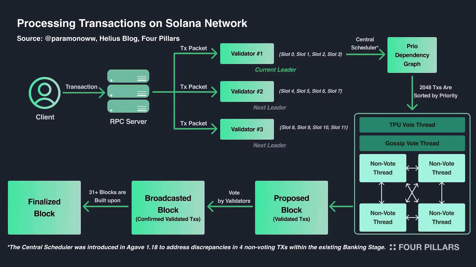 Transactions reach leaders through the Transaction Processing Unit (TPU). There are two main paths: