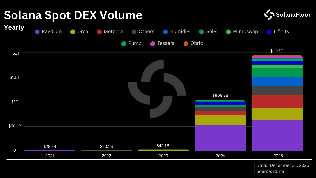 - Raydium—the largest execution-layer DEX, processing nearly $642 billion in spot volume in 2025. Its direct integration with OpenBook's on-chain order book gives it a hybrid AMM/order book model that appeals to market makers.